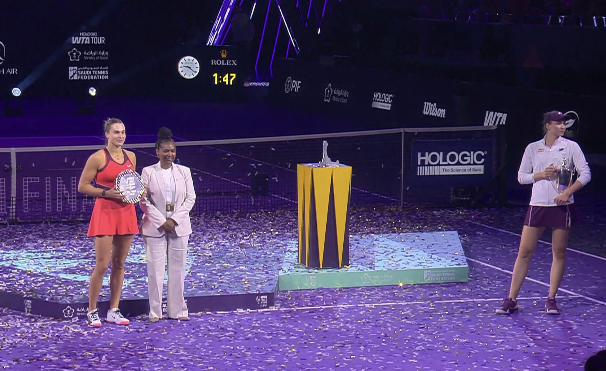 După meci, jucătoarele fac, de obicei, poze alături de oficialii WTA. Rybakina a pozat fără probleme alături de Sabalenka, însă atunci când Portia Archer s-a apropiat pentru fotografia oficială, jucătoarea din Kazahstan s-a îndepărtat câțiva metri și a refuzat să revină, făcând semn cu mâna ca ceremonia să continue fără ea.